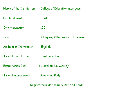 Name of the Institution : College of Education Morigaon Establishment : 1994 Intake capacity : 100 Land : 2 Bighas, 2 Kathas and 10 Leasas Medium of Instruction : English Type of Institution : Co-Education Examination Body : Guwahati University Type of Management : Governing Body Registered under society Act XXI 1860 |